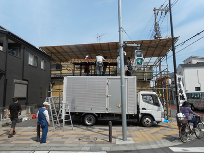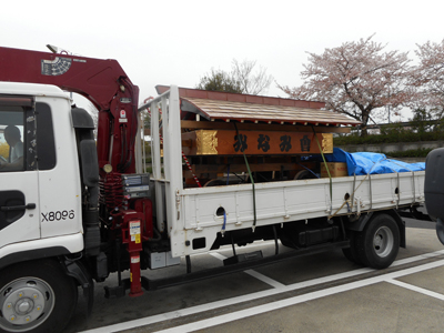 | 準備 山車引取り 4/10 みなみ會の山車をはじめ大きい飾り等は群馬にある倉庫に保管してあります。 ユニックにて搬出!山車が宙を舞います。 高速を走る【みなみ會山車】 ドライブインにて休憩。 到着。早速組立! 形になりました。 |