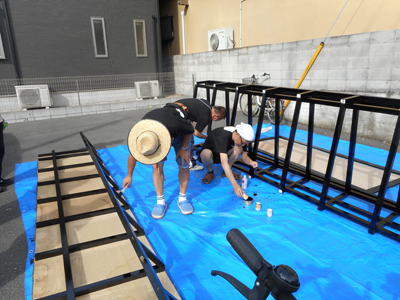 | 準備 5/15 今日もひたすら巻いてます。 こっちも相変わらずペンキ塗り。 池田薫秀先生の『書』が出来上がりました! 小割とのぼりもだいぶ立てました。 |